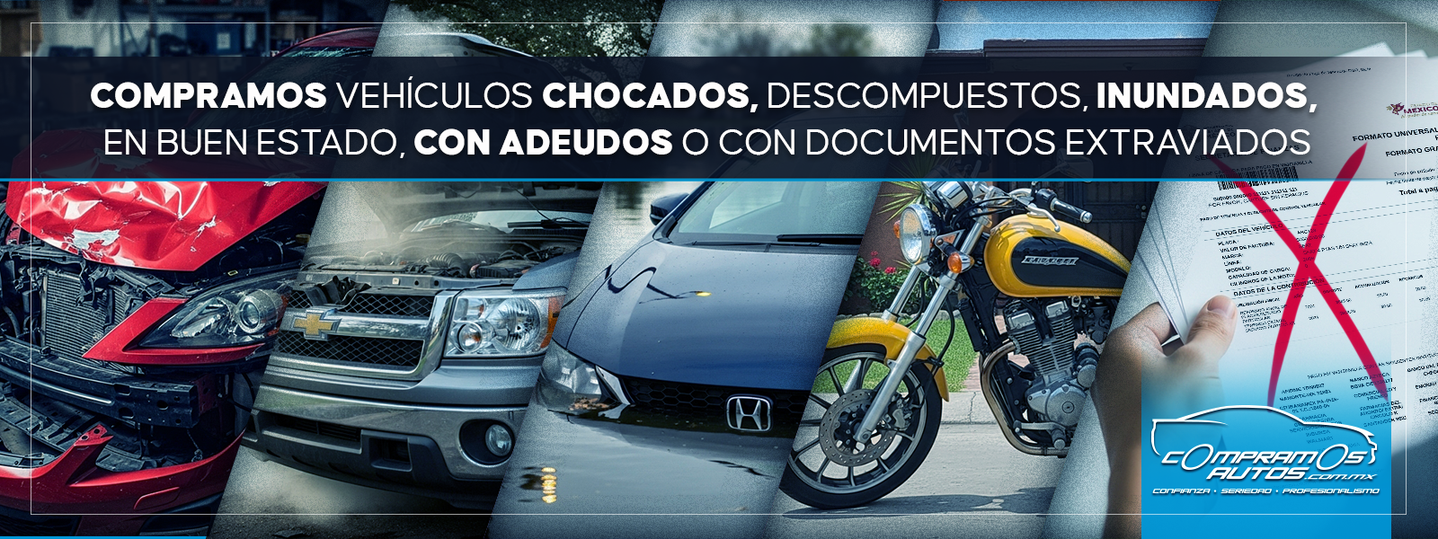 ¿necesita vender su vehículo? ¡nosotros lo compramos! Compramos Autos, Camionetas y Motos Chocados Vehículos descompuestos Con adeudos Inundados Cualquier Año y Modelo Documentos extraviados Compramos en toda la República Mexicana ¿POR QUÉ ELEGIR NUESTRO SERVICIO? Realizamos compra de flotilla de vehículos a empresas. Nuestro Sitio Web Oficial cuenta con seguridad y toda su información está totalmente protegida y confidencial. En Compramos Autos México nuestro compromiso es ofrecerle el mejor servicio, confianza, seriedad, transparencia y profesionalismo. contáctenos WhatsApp - 55 25 10 27 72 Llámanos al 55 46 18 90 54 Escríbenos a los correos electrónicos: compramosautosmx@hotmail.com ventas@compramosautos.com.mx Facebook Instagram YouTube Tik Tok
